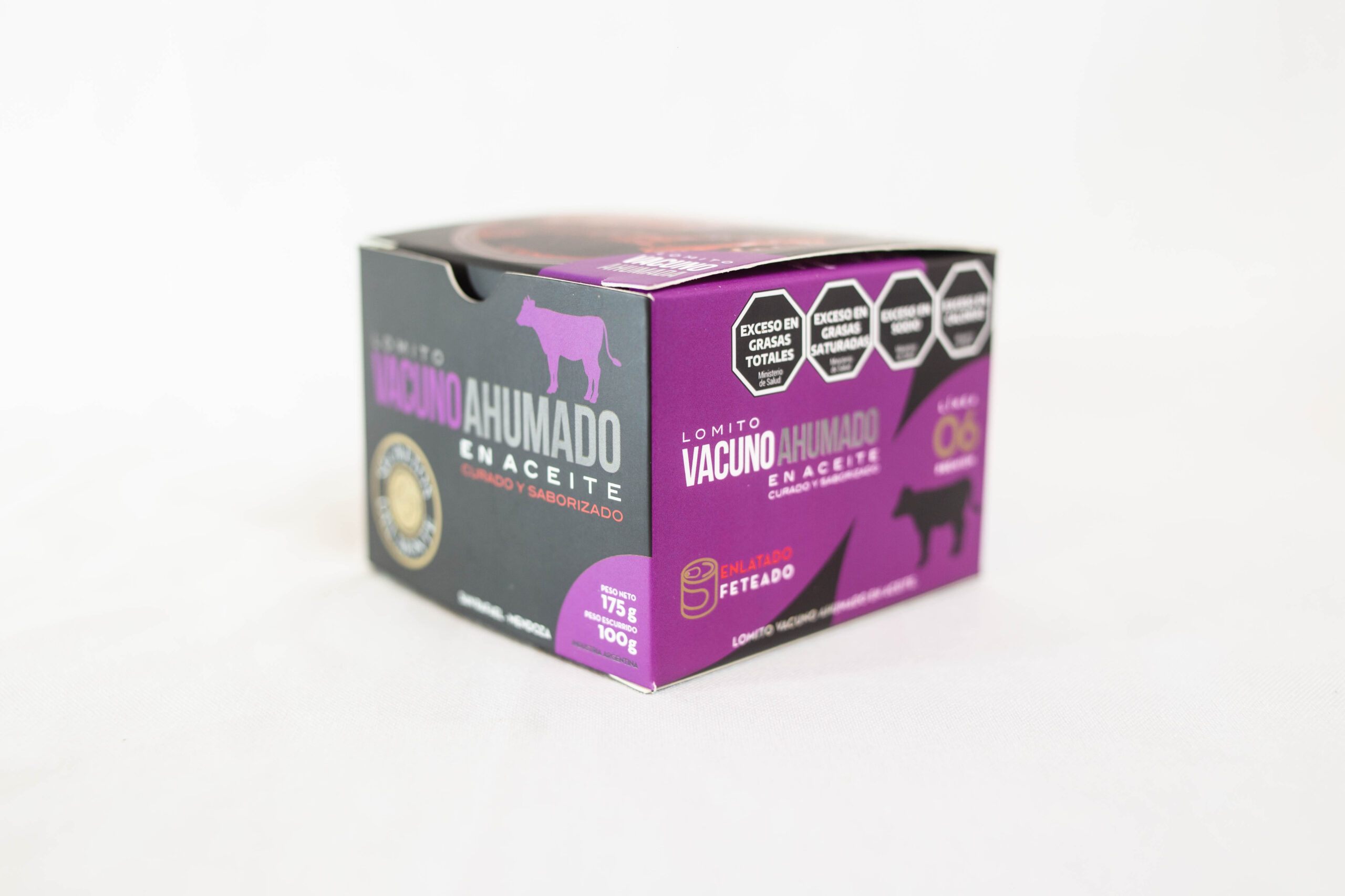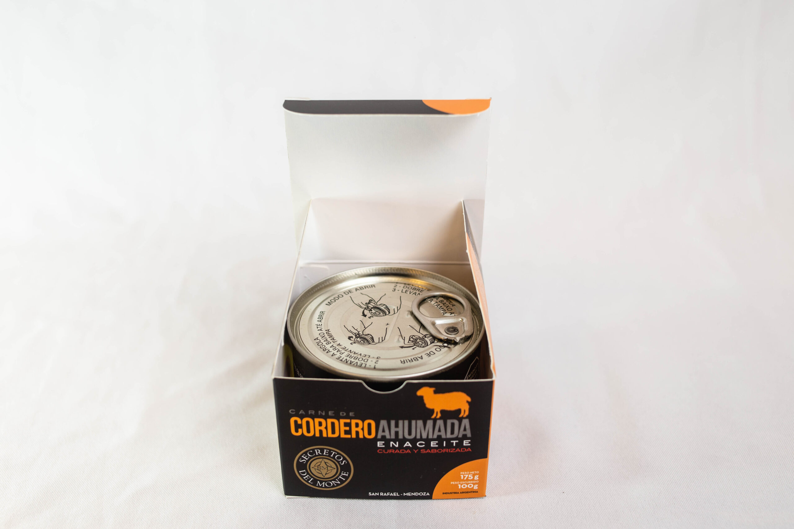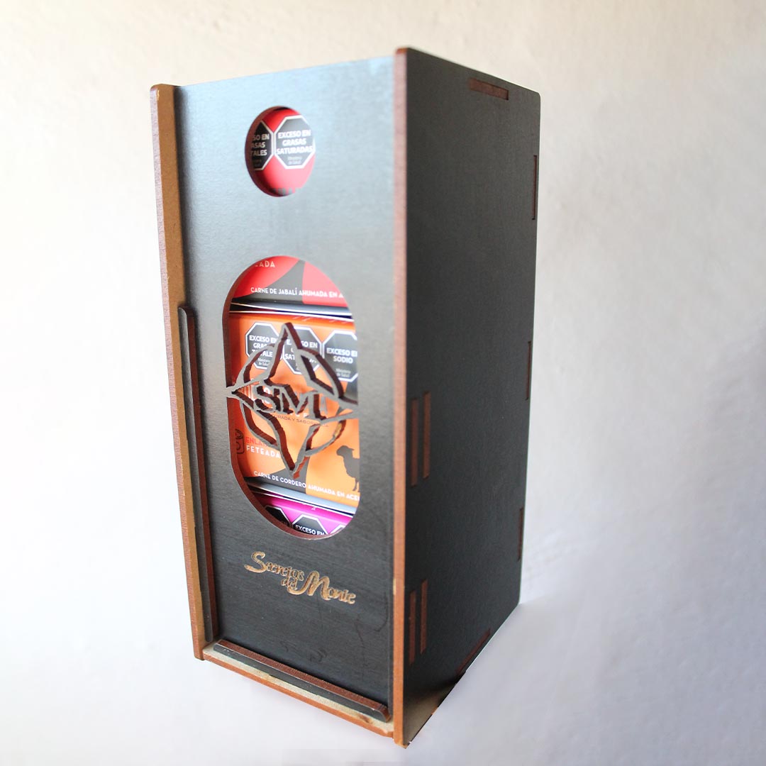 Detalle Estuche en deco madera. contiene 3 latitas de carnes ahumadas