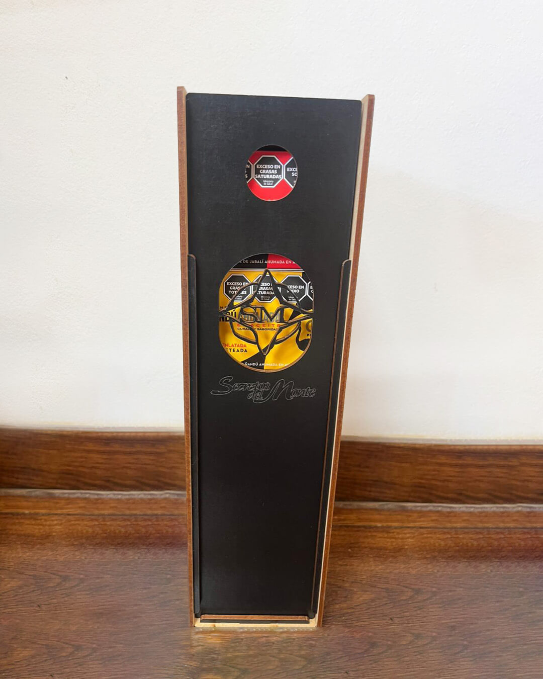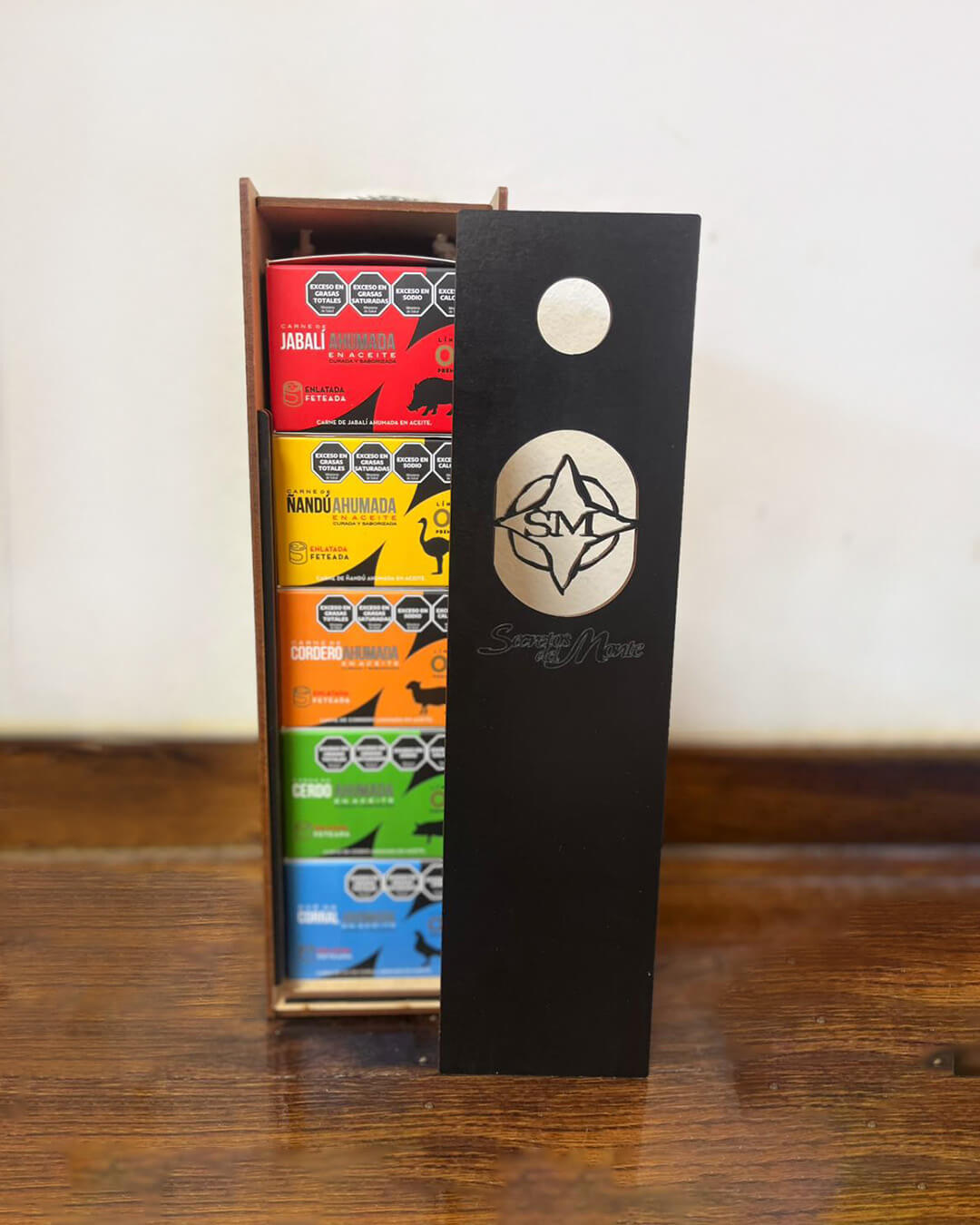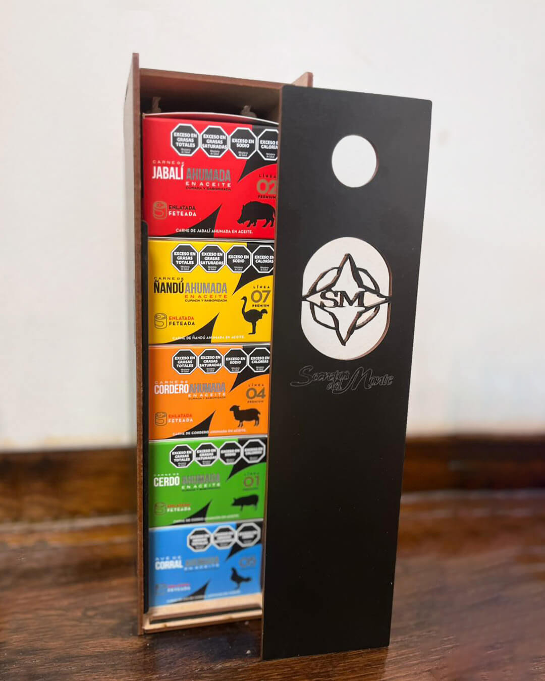 | Detalle | Estuche en deco madera. contiene 5 latitas de carnes ahumadas |